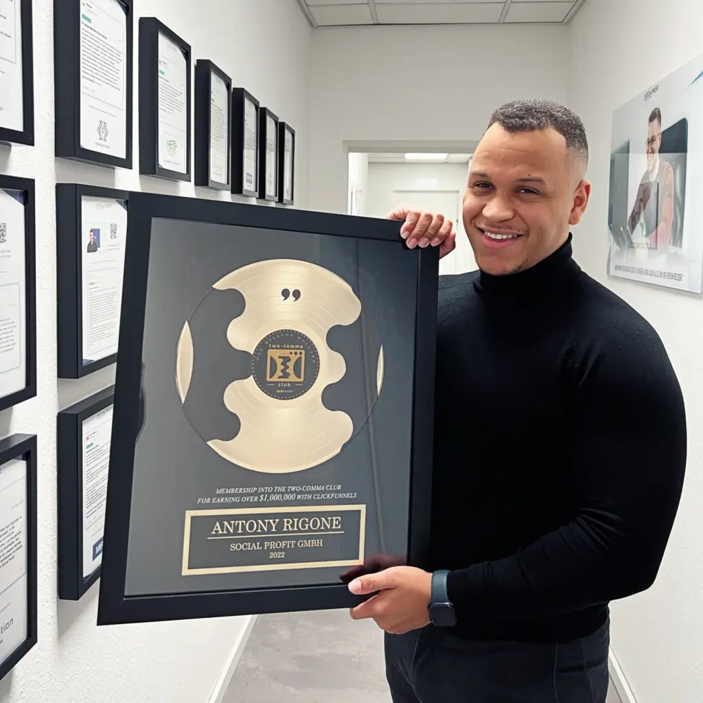Dank kontinuierlicher Weiterbildung und echter Praxiserfahrung stellte er in kurzer Zeit ein spezialisiertes Team zusammen und führte das Unternehmen eigenständig von null auf einen siebenstelligen Umsatz. Er weiß aus eigener Erfahrung genau, worauf es in der modernen B2B-Kundengewinnung und im Recruiting ankommt. Auf dem Bild sehen Sie unter anderem die Auszeichnung des Two Comma Club Awards als Bestätigung dieser Erfolge.